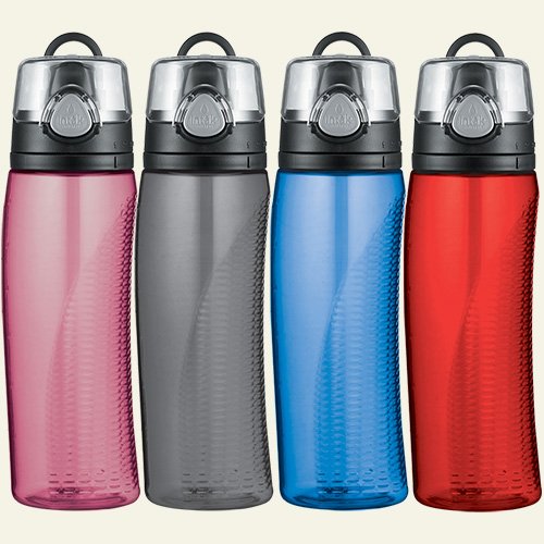 The Thermos Intak Hydration Bottle is made from BPA free, impact- resistant, dishwasher durable Eastman Tritan copolyester. It has a locking leak-proof lid with one-hand push button operation. There's a flip up loop for easy carrying; ergonomic design for comfortable usage. Monitor your intake with the rotating intake meter- perfect if you are trying to get those 8 glasses of water in everyday. Ideal for water, iced tea, juices and sports drinks: 24-ounce capacity.You will not be disappointed with